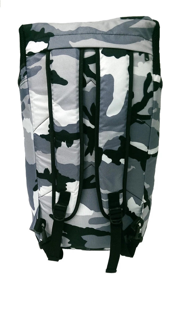 This gym duffel bag can be converted into a backpack. Large main compartment fits all of your gear and features two-way zippers and a mesh zipped pockets on both sides. Features two hand straps including a grab handle and detachable padded shoulder strap. Easily converts into a backpack: Equipped with 2 concealable backpack straps that can be hidden in the zippered back pocket when not in use. Bottom panel is padded to provide structure and comfort when worn as a backpack. Urban camo design and screen printed logo graphics.